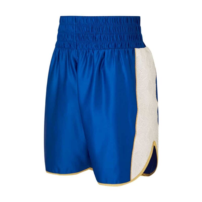 Satin Butler Boxing Shorts with White Snake Panels and a Gold Trim are an increasingly popular Curved Hem Style Short.